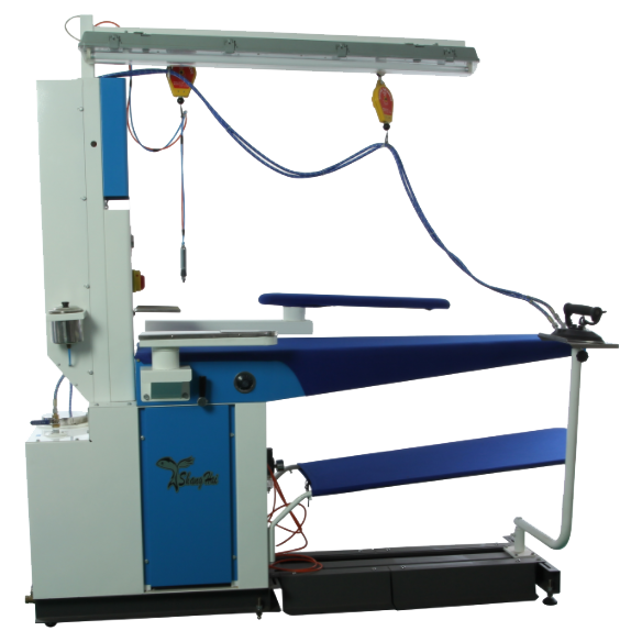 It can use as a spotting table with jet gun. It has strong absorpsion, dehumidify fast. It has good performance when it was used for wool, silk, fluff, because it can blow out wind for ironing. It is good at ironing skirt.